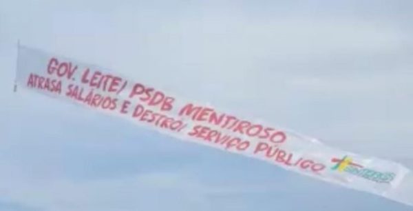 O avião, que percorreu as praias de Capão da Canoa até Torres, exibia os dizeres “GOV. LEITE/PSDB MENTIROSO – ATRASA SALÁRIOS E DESTRÓI SERVIÇO PÚBLICO”.