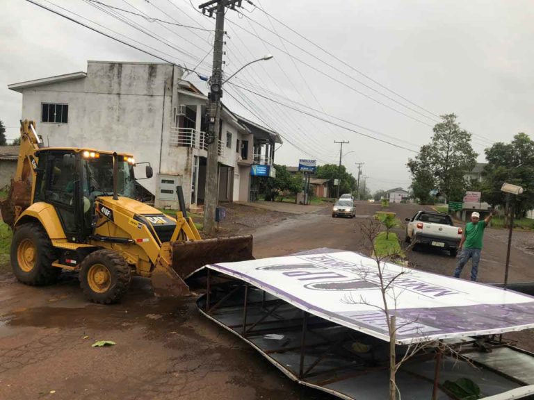 Diversas placas de publicidade de estabelecimentos comerciais foram arrancadas pelo vento, além do relógio da Sicredi, exposto em uma rótula, na Avenida Brasil, no Centro.