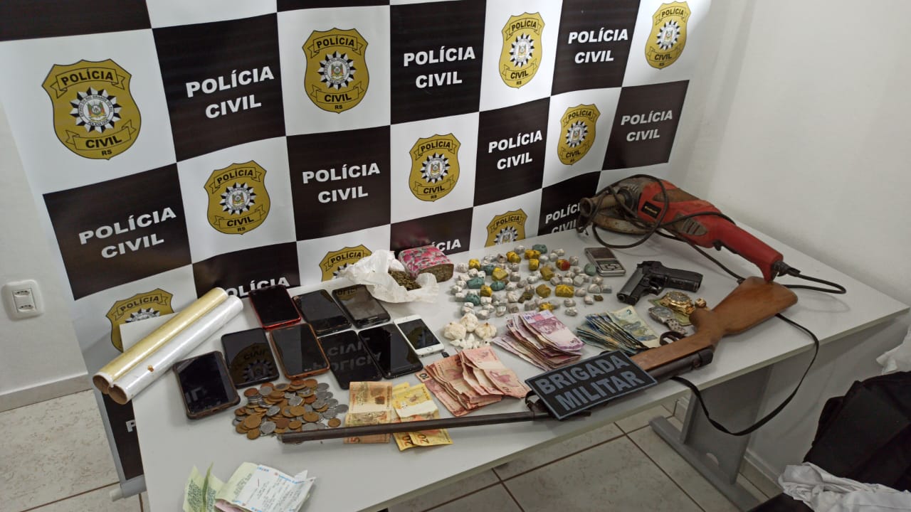 Na ação, foi apreendida uma grande quantidade de maconha e cocaína, uma espingarda calibre 5.5, uma pistola de gás, além de dinheiro e celulares.