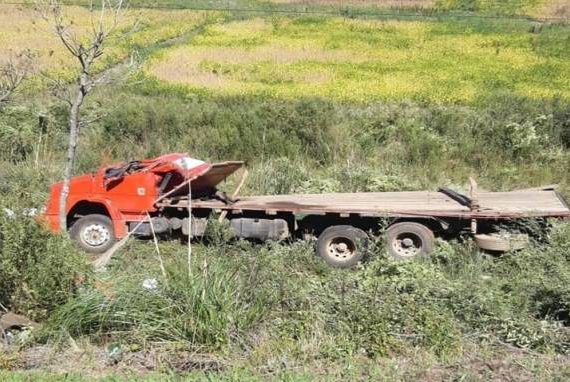 Um caminhão M.BENZ/L 1620, vermelho, com placas de Capão da Canoa, seguia no sentido interior x capital, quando o condutor perdeu o controle do veículo, saiu de pista e capotou.