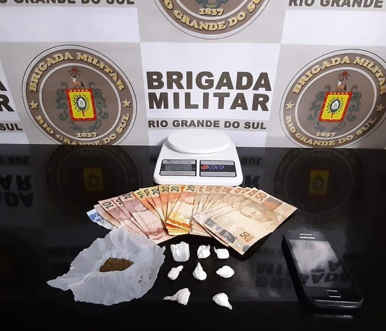 Com o homem foram localizadas duas porções de maconha pesando aproximadamente 3,4 gramas, R$557,00 em espécie, sete petecas de cocaína pesando 3,3 gramas e uma balança de precisão. Após a prisão foi conduzido para Delegacia de Polícia.