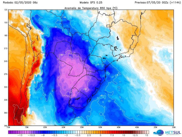 Conforme a MetSul Meteorologia, a chuva desta frente fria começa a ser sentida no Estado entre os dias 5 e 6, mas o frio de sua massa polar só deve chegar do dia 6 em diante. A queda da temperatura mais acentuada deve ocorrer no dia 7, com registros de geada, aumentando no dia 8.