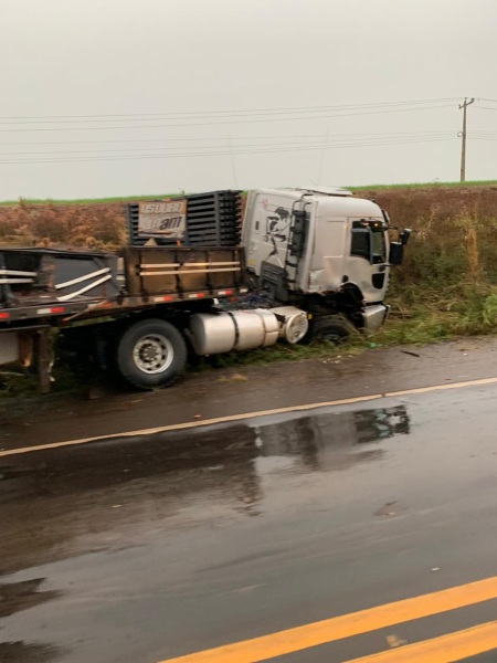 O veículo ficou atravessado na rodovia. A Polícia Rodoviária Federal está no local, e o trânsito segue lento.