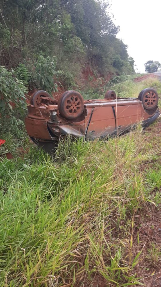 Um Chevrolet Meriva de cor verde, com placas de Braga, que seguia no sentido cidade – BR-468, acabou capotando no sentindo contrário da pista.