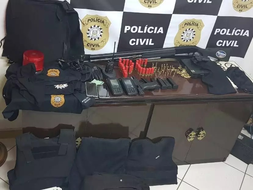 Na manhã desta segunda-feira, a Polícia Civil de Carazinho, com apoio da Polícia Civil de Ijuí e da PRF daquele município, realizou ação que resultou na prisão de quatro criminosos oriundos da região metropolitana, recuperação de um veículo roubado e a apreensão de armas de fogo, coletes balísticos, munições, camisetas da Polícia Civil, giroflash e dinheiro.