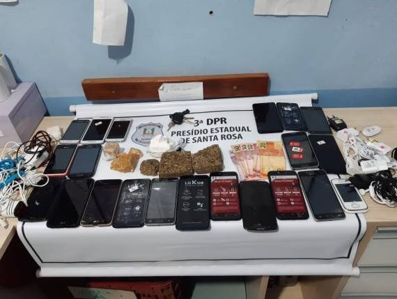 Foram encontrados 21 aparelhos celulares, 12 carregadores e substâncias entorpecentes: cocaína, crack e maconha. No mesmo momento foi dada a voz de prisão e tomada as devidas providências.