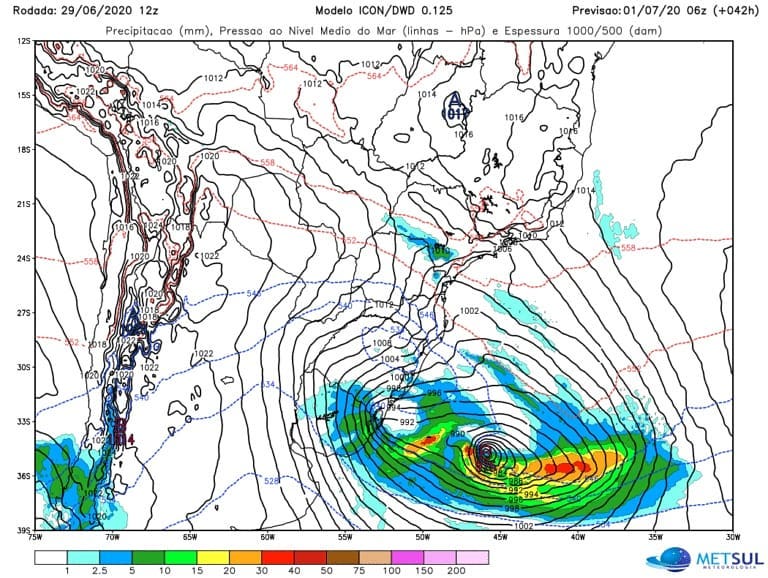 É exatamente o que se espera ocorrerá entre o Sul do Brasil e o Atlântico entre esta terça e a quarta-feira. Veja no mapa que o modelo alemão Icon, disponível ao assinante na seção de mapas, projeta 1.001 hPa no centro da baixa sobre o Sul do Paraguai na madrugada desta terça, mas 24h depois, na madrugada de quarta, a baixa pressão já como ciclone formado estará com 976 hPa sobre o Atlântico, uma queda de 25 hPa em 24h.