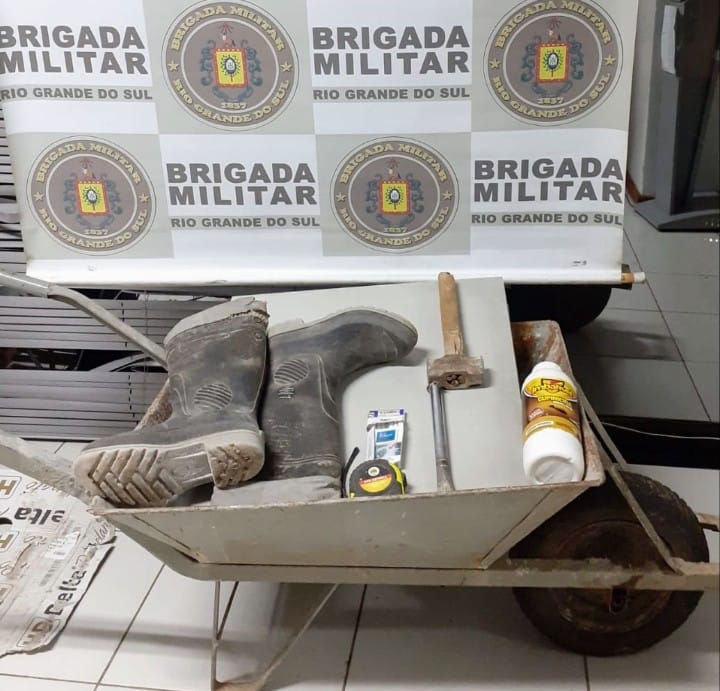 Foi constatado que a porta havia sido arrombada e diversos materiais foram levados: unidades de cerâmica, porcelanato, marreta, talhadeira, uma trena, um litro de veneno, um par de botinas de borracha e um carrinho de mão.