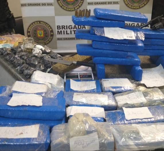 A guarnição deslocou até o local e procedeu a abordagem do suspeito no momento que saía para a área da casa com uma sacola nas mãos. Ele foi identificado como um homem de 19 anos, natural de Ijuí, sem antecedentes criminais. Na sacola foi localizado dois tijolos de maconha e uma folha de papel com a inscrição Kiko e Cleyton Ijui. Foi avistado na mesa da sala da residência: 01 tijolo de maconha e mais algumas porções fracionadas , 01 faca, 01 tabua pra cortar e uma balança de precisão. Ao verificar o porão da residência, foi localizados 25 tijolos de maconha, 01 estufa com 03 pés de maconha, e outros objetos. Num dos quartos foi localizado um pote com a quantia de R$ 2064,60 em espécie.