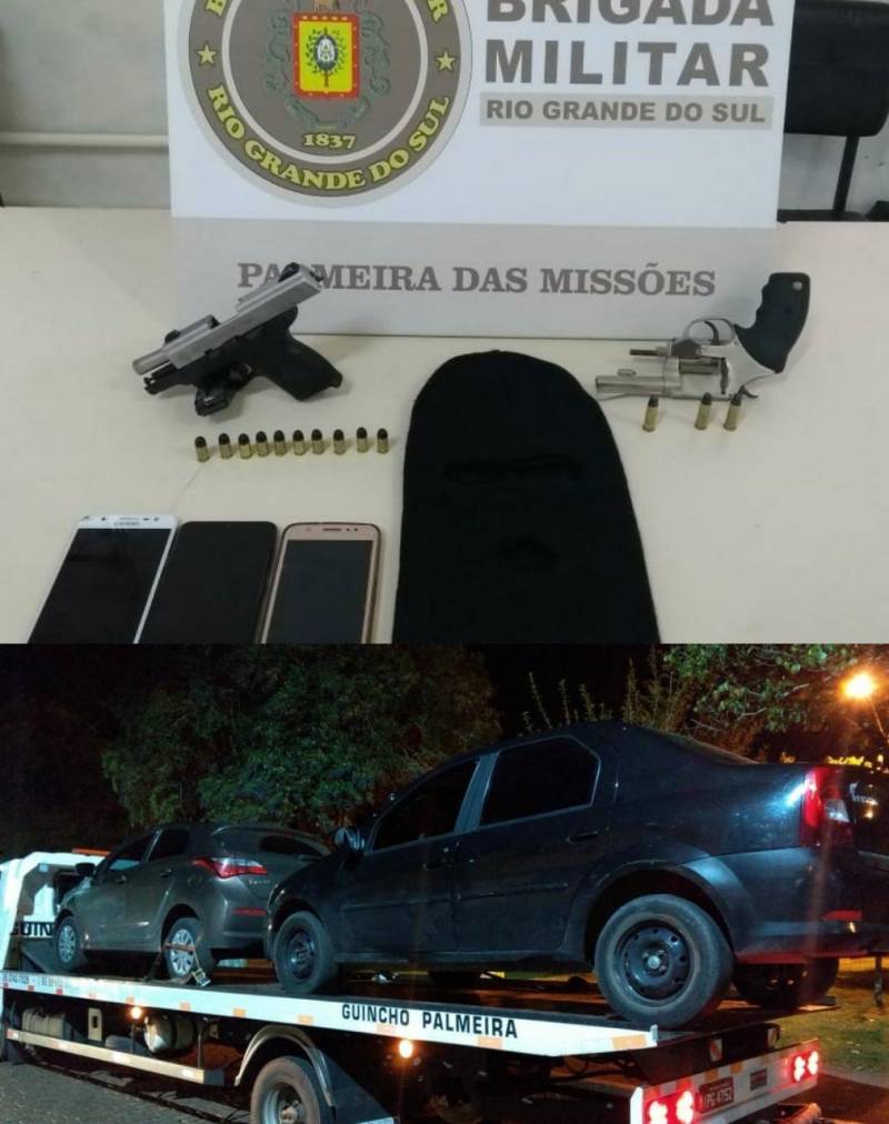 Armas, veículos, três celulares e uma touca ninja foram apreendidas, aos indivíduos foi dada voz de prisão e todos encaminhados à Delegacia de Polícia de Palmeira das Missões para registro da ocorrência, posterior encaminhados ao Presídio Estadual local.