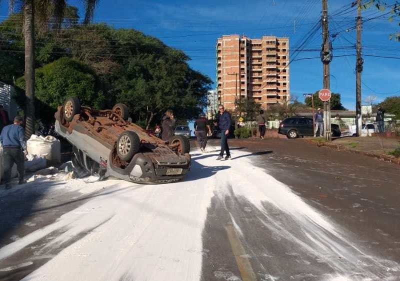 Casal de Ajuricaba sai ileso de capotamento no centro de Ijuí