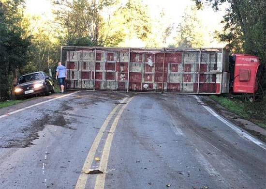 O acidente envolveu o caminhão com placas município de Santa Fé/PR, que trafegava sentido Casca – Vila Maria, quando o condutor perdeu o controle de direção em uma curva.