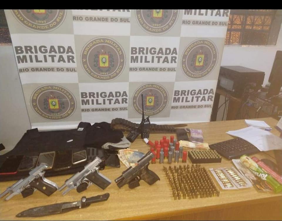 Na tarde de ontem, logo após o roubo, foram presos dois indivíduos, apreendidos três veículos, 3 pistolas calibre 380, 3 carregadores 380, 142 munições calibre 380, 22 munições calibre 12, 01 rádio transmissor na freqüência da BM, 2 coletes balísticos, dinheiro, 7 aparelhos de celular e 01 cartucheira.