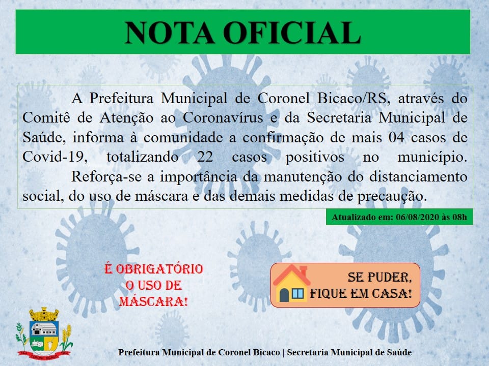 Em nova nota emitida na manhã desta quinta-feira (06), o município de Coronel Bicaco confirmou mais 04 casos de COVID-19, totalizando 22 casos positivos.