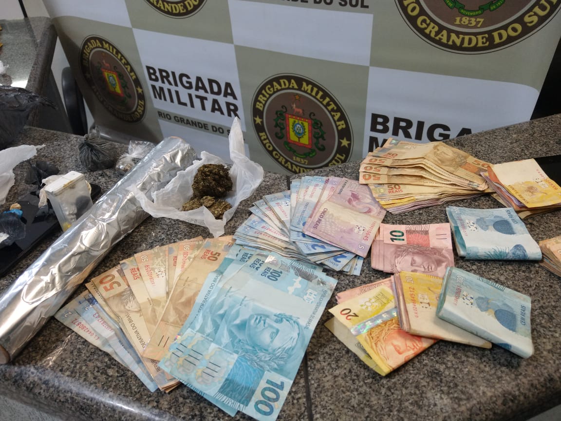 Durante a abordagem ao veículo foram identificados o condutor um homem de 31 anos, natural de Ijuí, possuidor de antecedentes criminais. Durante a busca pessoal foi encontrado com ele 02 telefones celulares e a quantidade de R$610,00 em espécie. A passageira foi identificada como uma mulher de 31 anos, natural de ijuí, possuidora de antecedentes criminais, com a qual foi encontrada uma bolsa com uma grande quantidade de dinheiro, folhas de cheques, maconha e telefone celular.