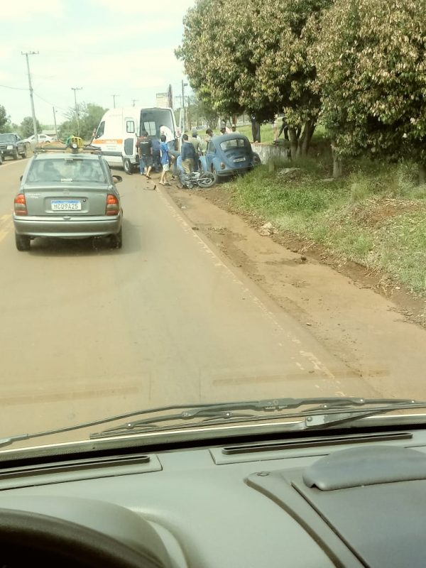 Informações preliminares são de que um veículo, não identificado pela reportagem até o momento, colidiu contra uma motocicleta que trafegava nos sentido centro/bairro, quando teria sido cortado a sua frente. Após o choque o condutor da motocicleta necessitou ser socorrido pela ambulância do município.