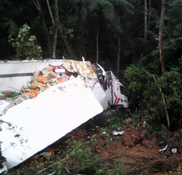 Uma carreta da empresa DelRio, carregada de verduras, de Ijuí, se acidentou na Serra Catarinense no município de Rancho Queimado.
