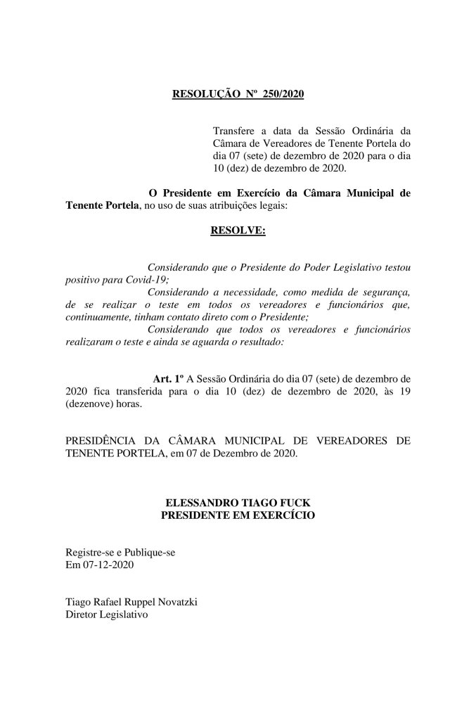 O presidente em exercício Thiago Fuck determinou através de uma resolução que a próxima sessão seja realizada na quinta-feira dia 10 de dezembro.
