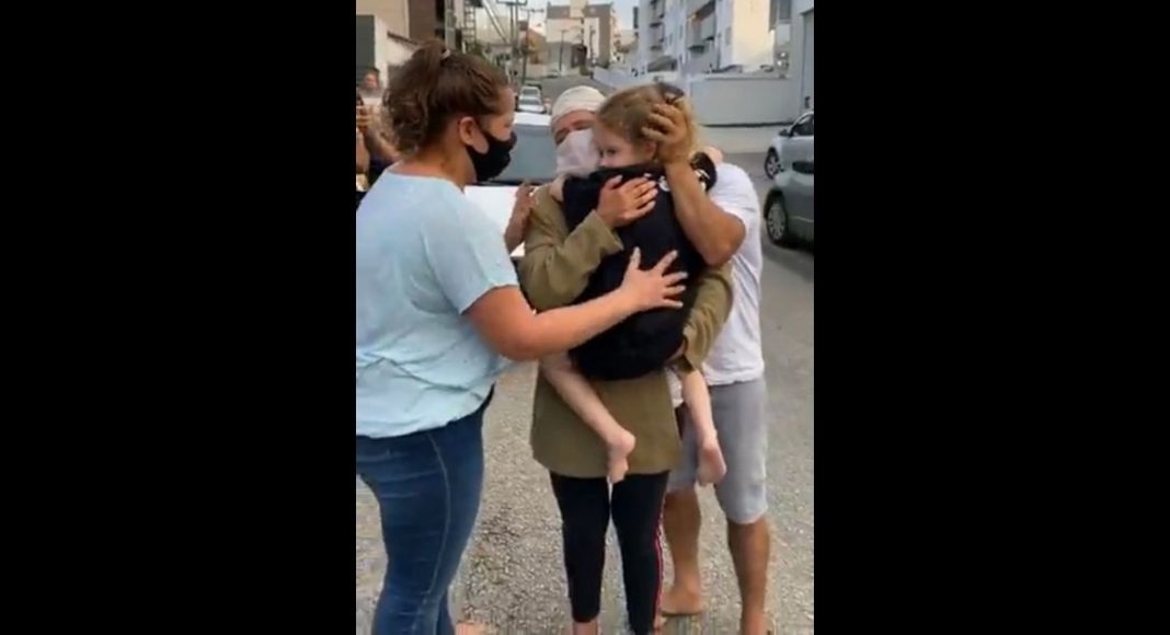 O pai, a mãe e irmãos reencontram a criança por volta das 4h30 em frente à Delegacia de Proteção à Criança, ao Adolescente, à Mulher e ao Idoso (Dpcami) em Palhoça.