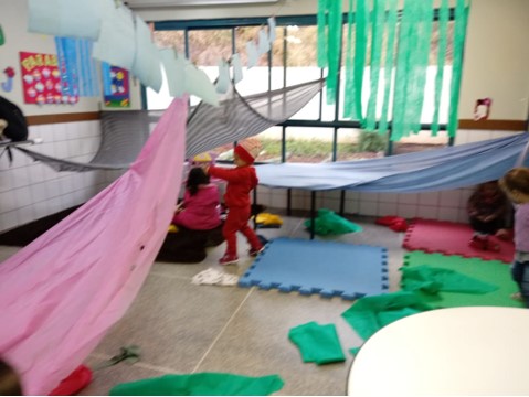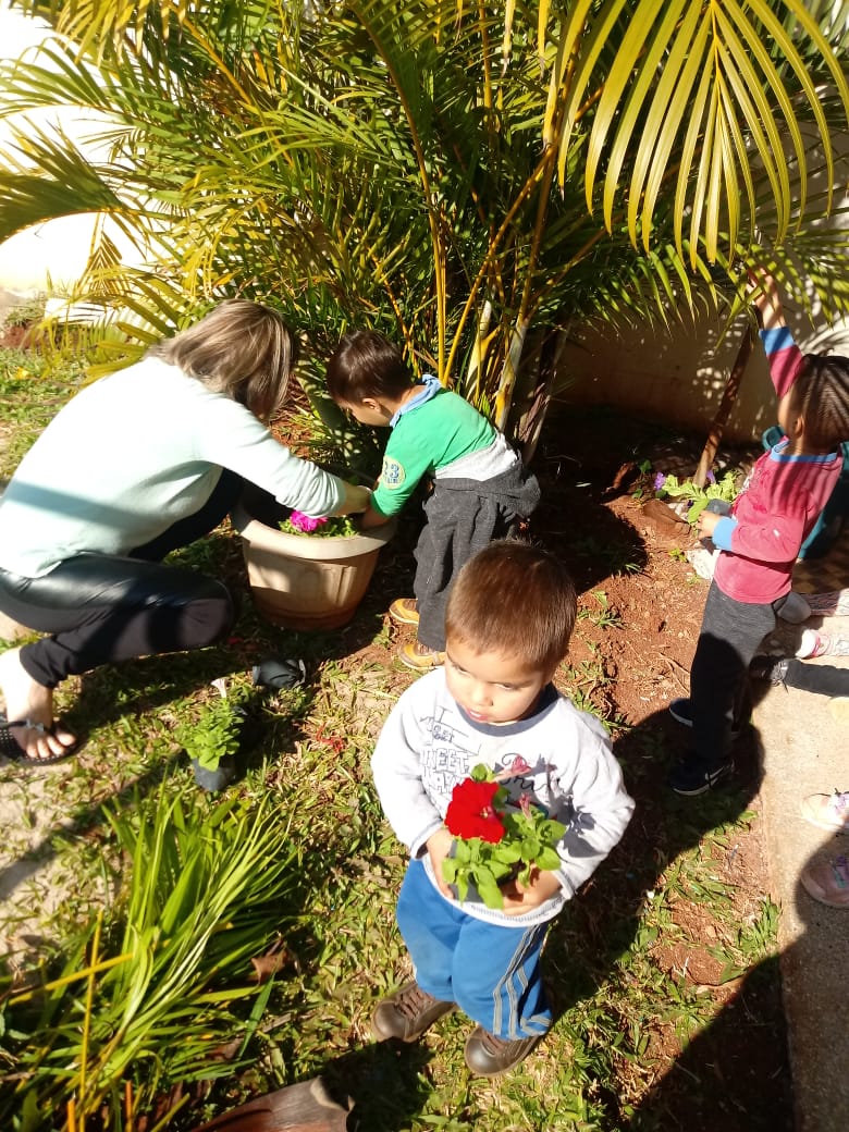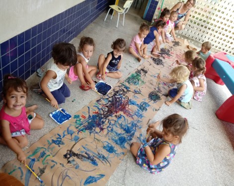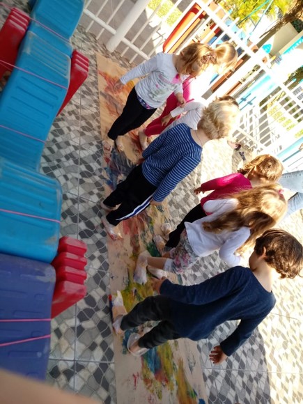 Reforçando o princípio de valorizar o saber da criança, apresentou-se aos alunos atividades e técnicas de pintura a partir das questões: quais cores existem?;de onde vem as cores ?; como posso criar as cores?; e a partir daí foi realizado pintura coletiva, plantio de flores (contato com terra/ambiente),manipulação de sanduíche (alimentação saudável), brincadeira de casinha na sala(cores das casinhas), atividades físicasde coordenação com fios de diferentes cores, pintura com pés envoltos em sacos “bolhas”(ativando o estágio sensório-motor).