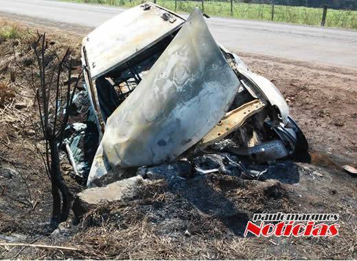 Uma caminhoneta Renault Duster totalmente destruída por incêndio, chama atenção de quem passa pela RS 342 no trajeto entre Independência e Catuípe, logo após a comunidade de Esquina Araújo.