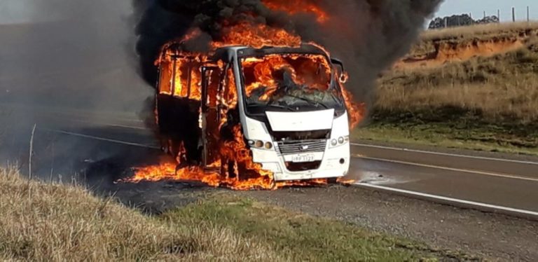 Micro-ônibus da Secretaria de Saúde pega fogo na BR 290