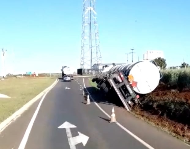 Uma carreta, carregada de combustível, saiu da pista no trevo oeste de Coronel Barros, caiu numa vala e acabou tombando no acostamento da rodovia.