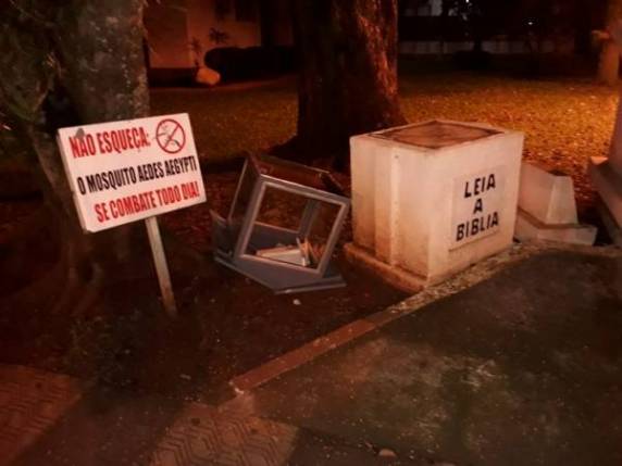 VÂNDALOS ATACAM BÍBLIA QUE FICA EXPOSTA NO LARGO DA PREFEITURA EM TRÊS DE MAIO