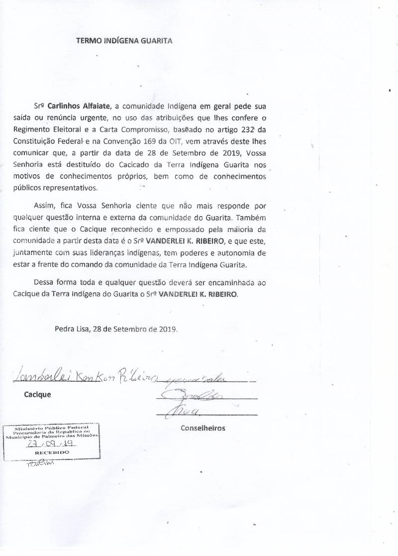 O programa Tribuna Popular trouxe em um dos destaques deste sábado, 27, uma entrevista com Vanderlei K. Ribeiro, liderança da Terra Indígena do Guarita. Vandinho, como é conhecido, supostamente, protocolou na Policia Federal e no Ministério Público Federal uma carta em que ele afirma que está destituindo o Cacique Carlinhos Alfaiate e está pessoalmente assumindo o cargo de cacique. Em virtude de recebermos os documentos apenas hoje, ou seja, fora do horário de expediente, não foi possível confirmar e nem buscar posicionamento com a Polícia Federal ou Ministério Público Federal.