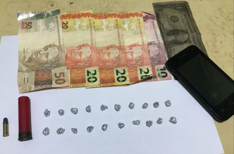 Na ação, foram apreendidos 20 pedras de crack, R$120,00 em moeda corrente e US$ 1 (um dólar), além de munições e celulares.