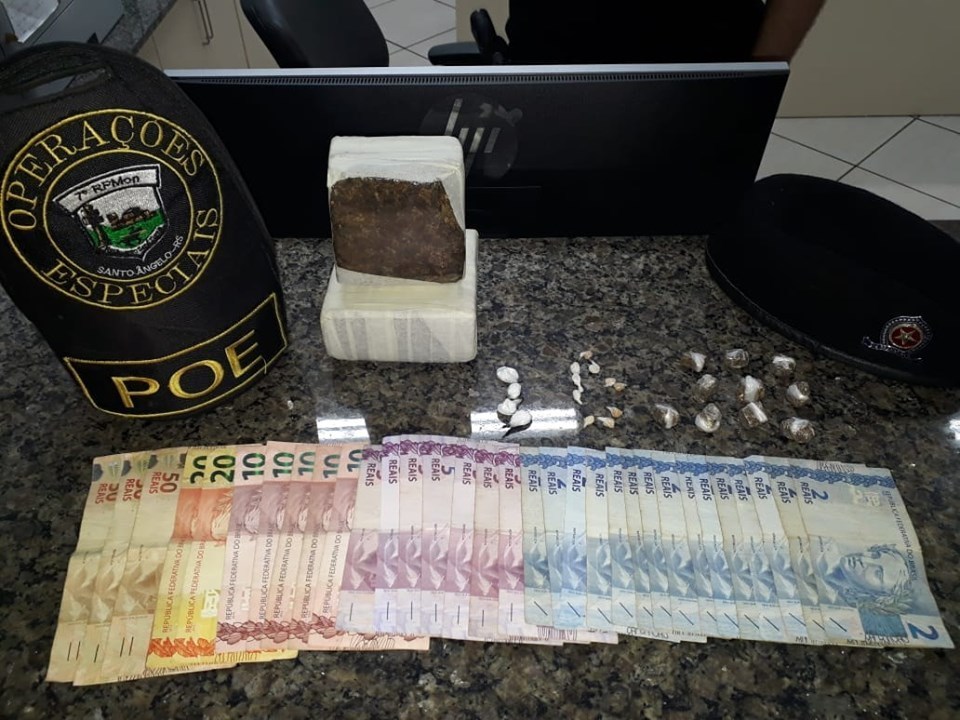 A Brigada Militar de Santo Ângelo, no sábado (01/06), em patrulhamento no Bairro Boa Esperança, abordou um veículo moto táxi, identificado a caroneira sendo uma menor de 14 anos, em revista pessoal localizado na cintura dela dois tijolos de maconha pesando 253 gr e 390 gr, 10 buchas fracionadas pesando 10.34 gr de maconha, 10 pedras de crak, pesando 0.76 gr, 04 buchas de cocaína pesando 1.28 gr e R$ 305 reais trocados.