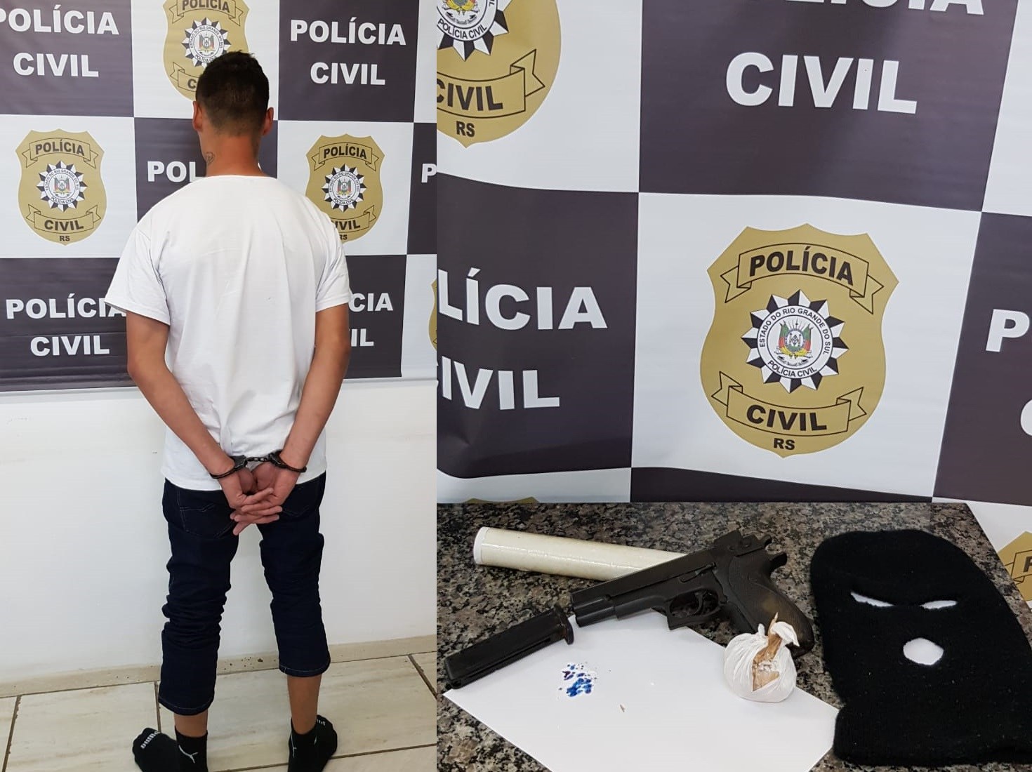 Na tarde de hoje, a Polícia Civil, através da Equipe de Investigação da Delegacia de Polícia de Santo Ângelo, prendeu em flagrante o indivíduo de iniciais J.C.C., de 24 anos, natural de Porto Alegre, pelo crime de tráfico de drogas, o qual estava na posse de 48 gramas de cocaína, balança de precisão, material pra embalar a droga, touca ninja, e um simulacro de pistola.
