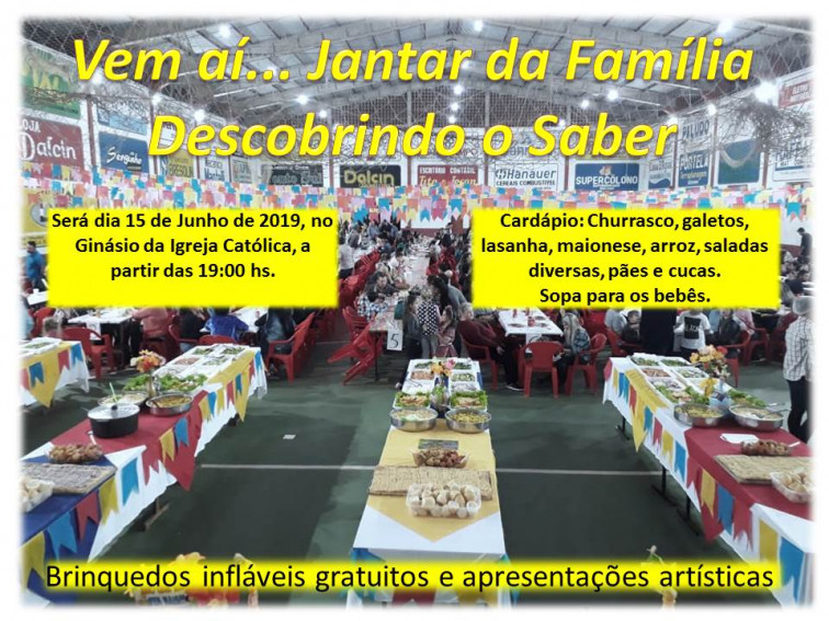 A Escola Municipal de Educação Infantil Descobrindo o Saber comemora seus 7 anos de atividade com crianças de 6 meses a 6 anos de idade e conta atualmente com 160 famílias em seu espaço educacional.Para comemorar , no dia 15 de junho, será realizada a FESTA DA FAMÍLIA, nas dependências do Ginásio da Igreja Católica. Toda a comunidade está convidada a participar.