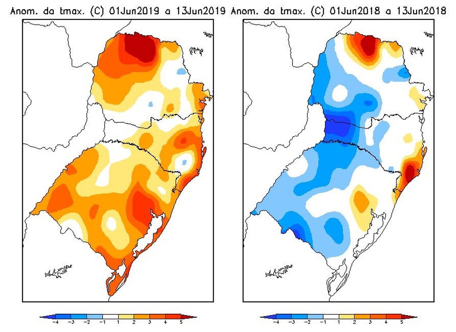"Normalmente, eles ocorrem em maio, e não em junho como está ocorrendo neste ano. O período é que mudou e não o fator em si. Tanto é que alguns produtores contam com o veranico para as agriculturas", afirma o Ainda segundo Luengo, ano passado, nesta mesma época do ano, o fenômeno La Niña estava presente no estado, o que fazia com que as temperaturas ficassem mais baixas. Os mapas acima mostram que o mês de junho de 2018 estava mais frio que o de 2019.