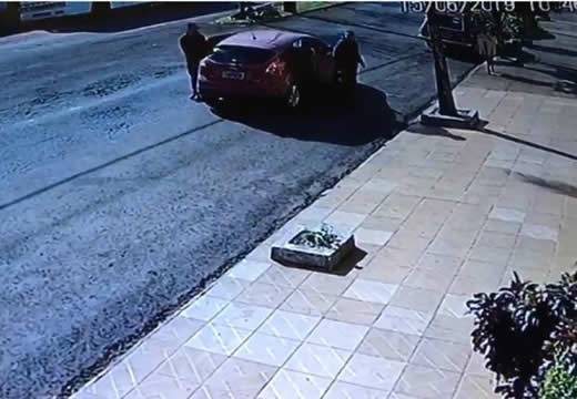 Na manhã de ontem (15), em Guarani das Missões, esse mesmo veículo abasteceu num posto de combustível, sendo que o frentista observou algo suspeito e de imediato fez comunicação a outras pessoas. O carro passou a circular pelas ruas da cidade e certo tempo depois, dois indivíduos entraram num mercado localizado na Avenida Castelo Branco. Mesmo com a temperatura elevada, chamava a atenção que um estava vestindo jaqueta com capuz e óculos escuro, enquanto o outro vestia jaqueta e boné.