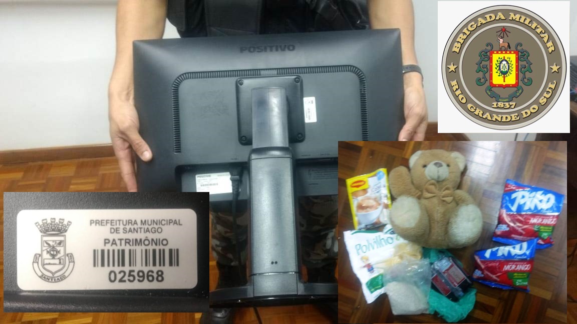 Ao verificar que o monitor possuía identificação do Município de Santiago, a BM entrou em contato com servidores da Prefeitura e confirmou que o monitor pertencia ao Centro de Referência da Mulher (CREAS) - da Secretaria de Desenvolvimento Social. Do local também foi furtada uma jarra elétrica, porém não foi localizada com o acusado que, para furtar os objetos, arrombou uma janela conforme apuraram os policiais militares em diligências.