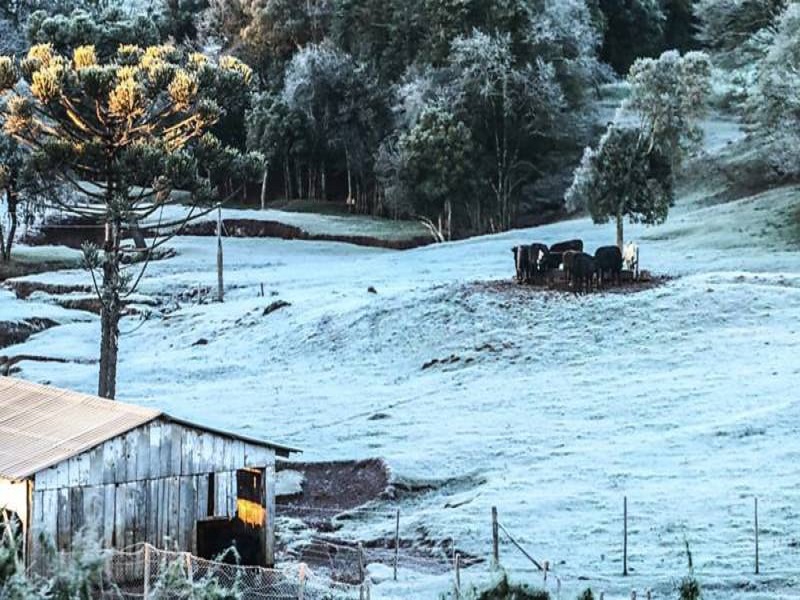 Na quinta-feira (27), a frente fria se afasta e a massa de ar polar favorece a ocorrência de geada em grande parte do Rio Grande do Sul e no interior de Santa Catarina.