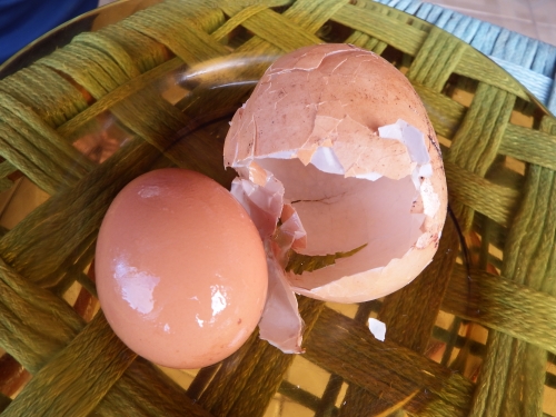 Uma galinha do casal pôs um ovo na manhã desta quinta-feira, com outro ovo com casca dentro.