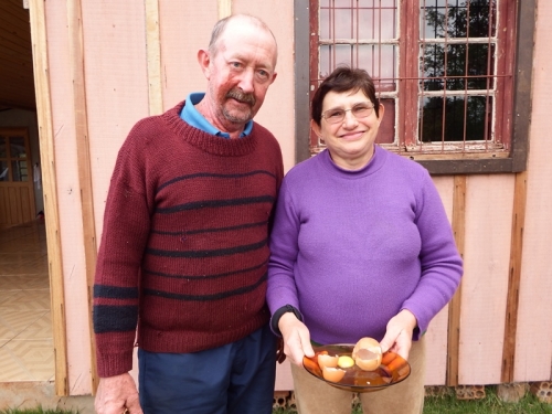 Abaixo fotos do casal Geraldo e Semilda Schlindwein e da galinha da espécie poedeira que pôs o ovo com a anomalia.