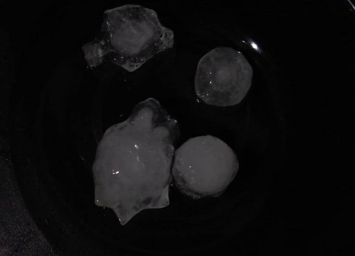 A foto acima mostra o tamanho das pedras de granizo na localidade de Santa Auta. O produtor Erlino Bierhals, relatou que sua família acordou assustada com o temporal, por volta das 04h da manhã.