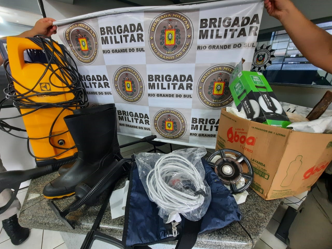 Foram localizados todos os objetos furtados junto a ele, sendo: um lava jato Electrolux; par de botas; uma bomba de encher pneu; uma serra; uma sacola azul; 15 metros de fio fibra óptica; um fogareiro; uma caixa com diversas ferramentas.