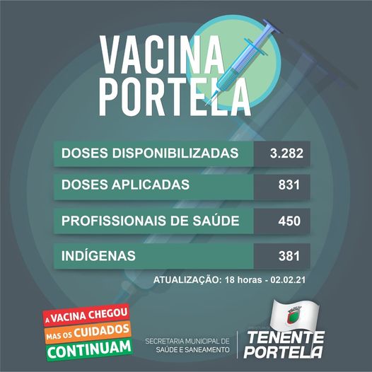 Todas as vacinas são destinadas exclusivamente para profissionais da saúde e indígenas. Na área de saúde, já receberam a primeira dose 450 trabalhadores e na comunidade indígena já foram vacinadas 381 pessoas, totalizando assim 831 portelenses, conforme a última atualização. Na população indígena, o trabalho é de responsabilidade do Polo Base Guarita da SESAI. Já os profissionais da saúde estão sendo imunizados pela equipe da Secretaria Municipal da Saúde.