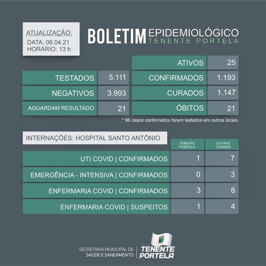 Boletim epidemiológico de Tenente Portela - Dia 06/04/2021