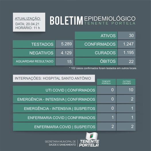 Boletim epidemiológico de Tenente Portela - Dia 20/04/2021