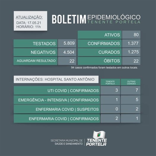 Boletim epidemiológico de Tenente Portela - Dia 17/05/2021