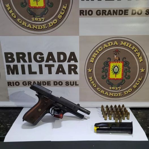 A guarnição de serviço deslocou até a Rua Itaqui para apoiar uma oficial de justiça no cumprimento de uma medida protetiva de afastamento do lar, sendo que ao chegar no local foi feito contato com a vítima, a qual informou aos policias que seu marido possuía uma arma. Após buscas foi localizado uma pistola cal 9mm, 02 carregadores e 26 munições intactas.