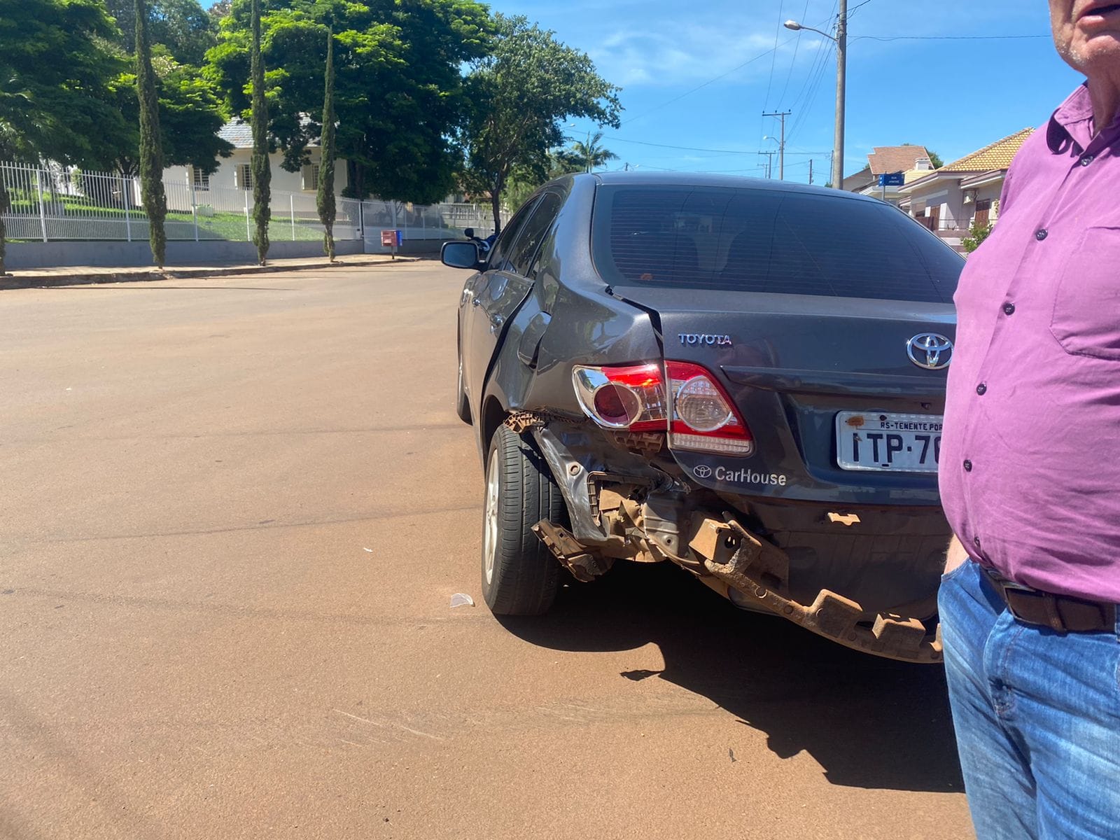 Houve um abalroamento danificando ambos os carros, sendo o da prefeitura do lado esquerdo dianteiro próximo a roda do veículo e o outro carro envolvido com danos no para choque traseiro.