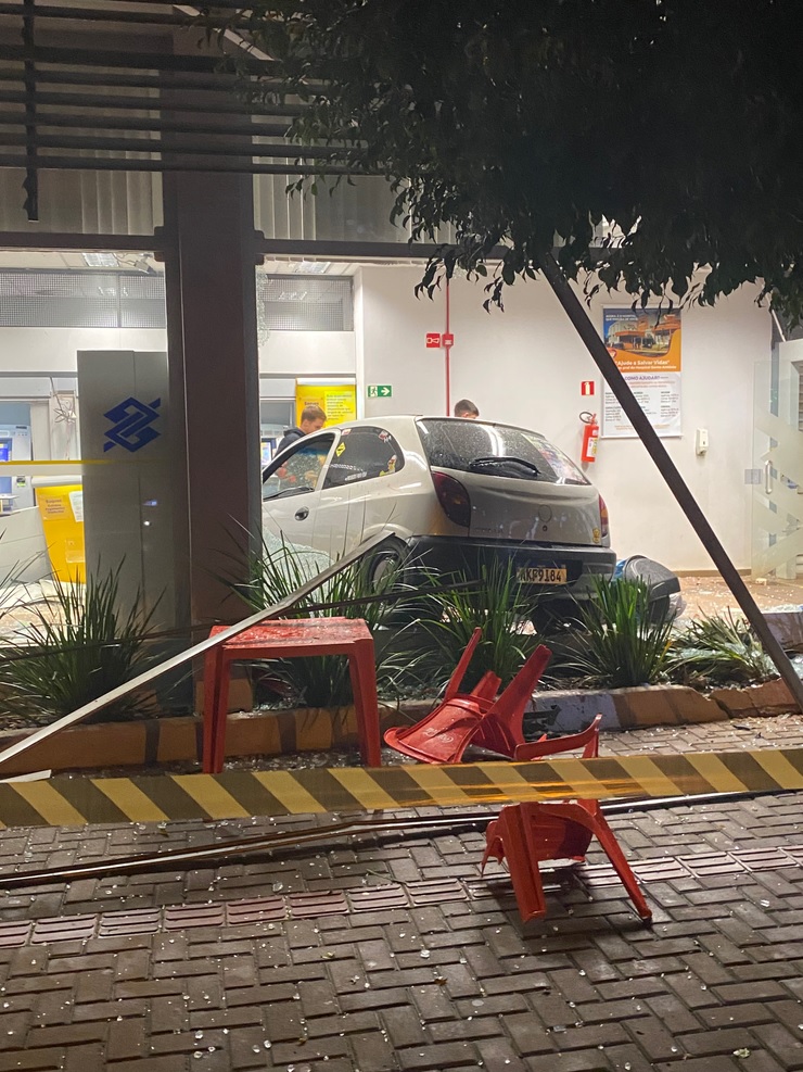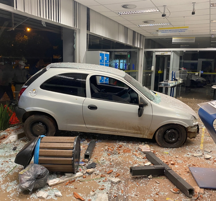 Um Celta desgovernado invadiu e destruiu parcialmente o pronto atendimento de uma agência bancária do Banco do Brasil na noite deste sábado, 30 de abril, no centro de Tenente Portela.