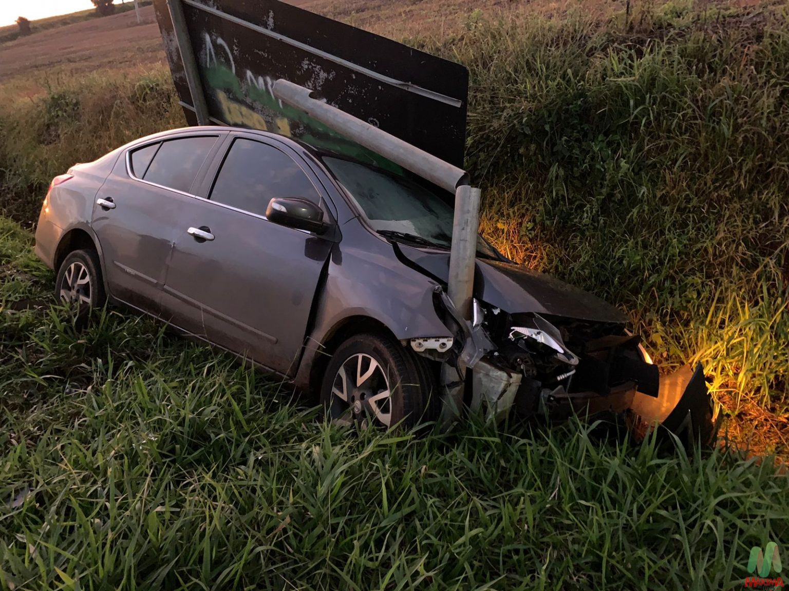 Um veículo Nissan Versa com placas de Ronda Alta que seguia no sentido Rondinha a Ronda Alta saiu da pista, colidiu no barranco e em uma placa de sinalização as margens da rodovia.