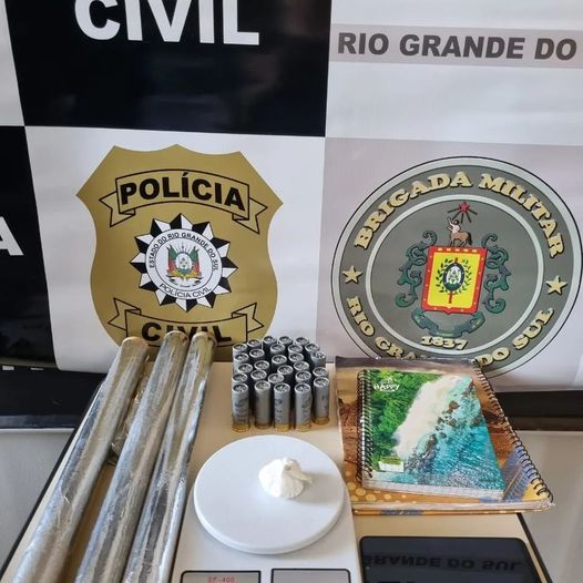 Com o proprietário da residência foi encontrado cerca de 19 gramas de uma substância análoga à cocaína e 1 telefone celular, na residência foi apreendida 1 balança de precisão, 27 cartuchos intactos Cal 12 marca CBC. Encaminhado à delegacia da Polícia Civil onde foi lavrado o flagrante.